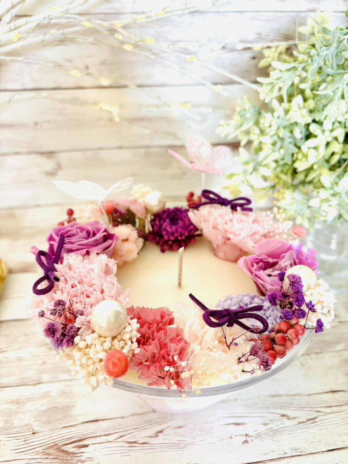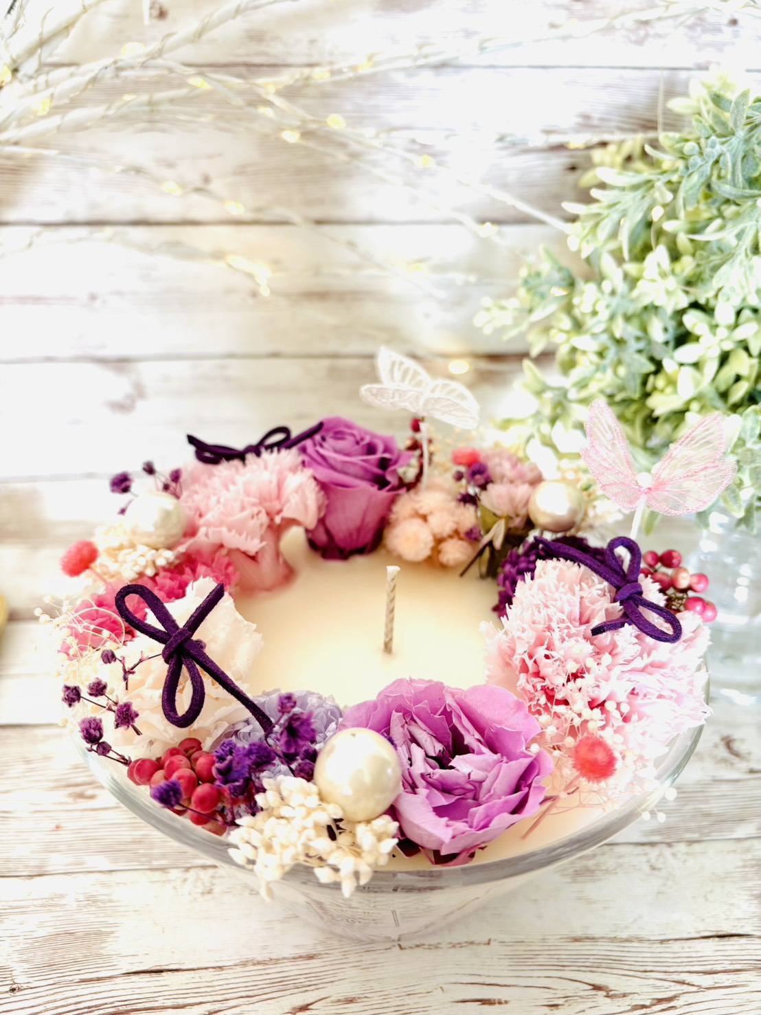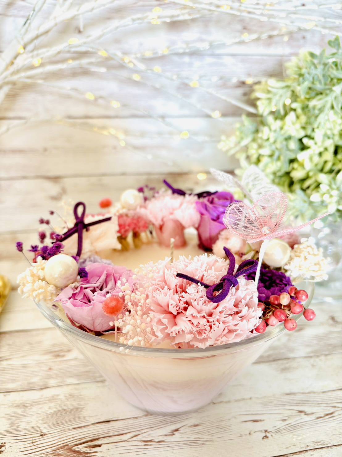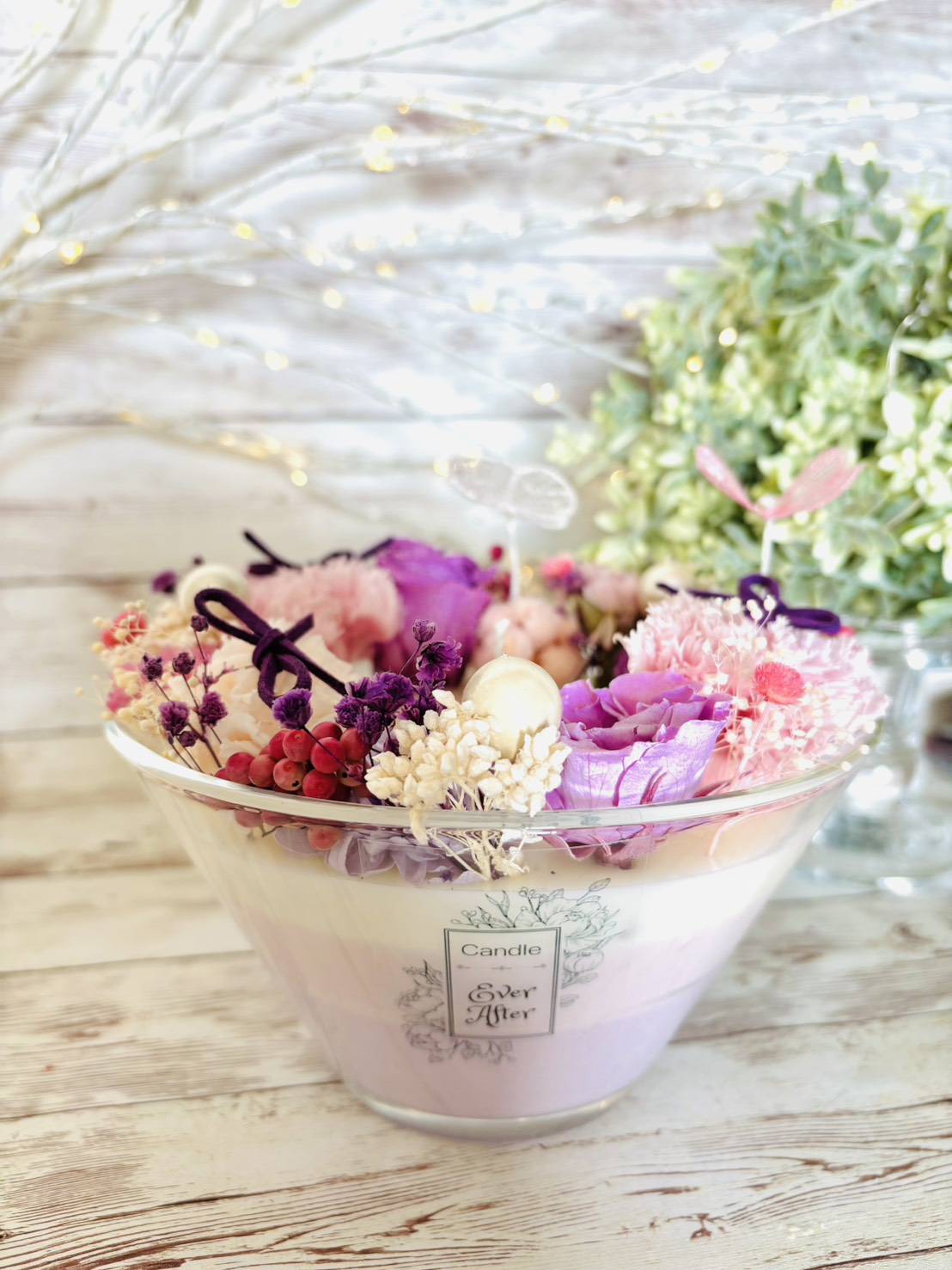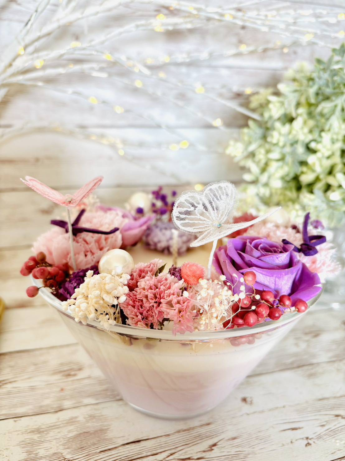 大きなガラスの器を小さな庭に見立ててお花たっぷりのキャンドルに仕立てました。