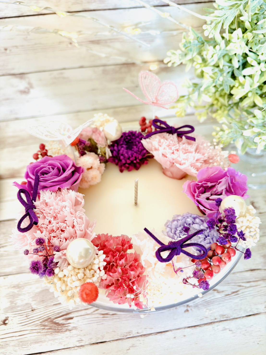 ソイキャンドルは三層になっておりパープルにはローズ、ピンクにはピンクキス、ホワイトにはピーチのアロマオイルで香り付けしましたので、燃焼が進むにつれて香りの移り変わりもお楽しみいただけます。