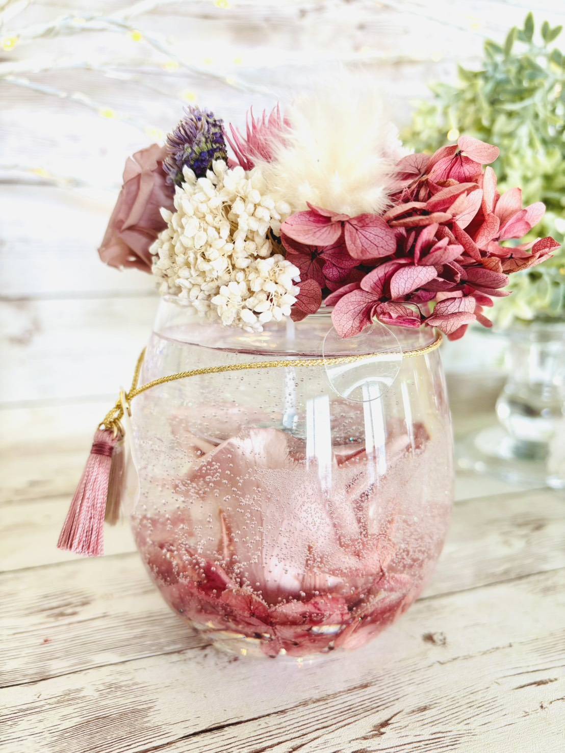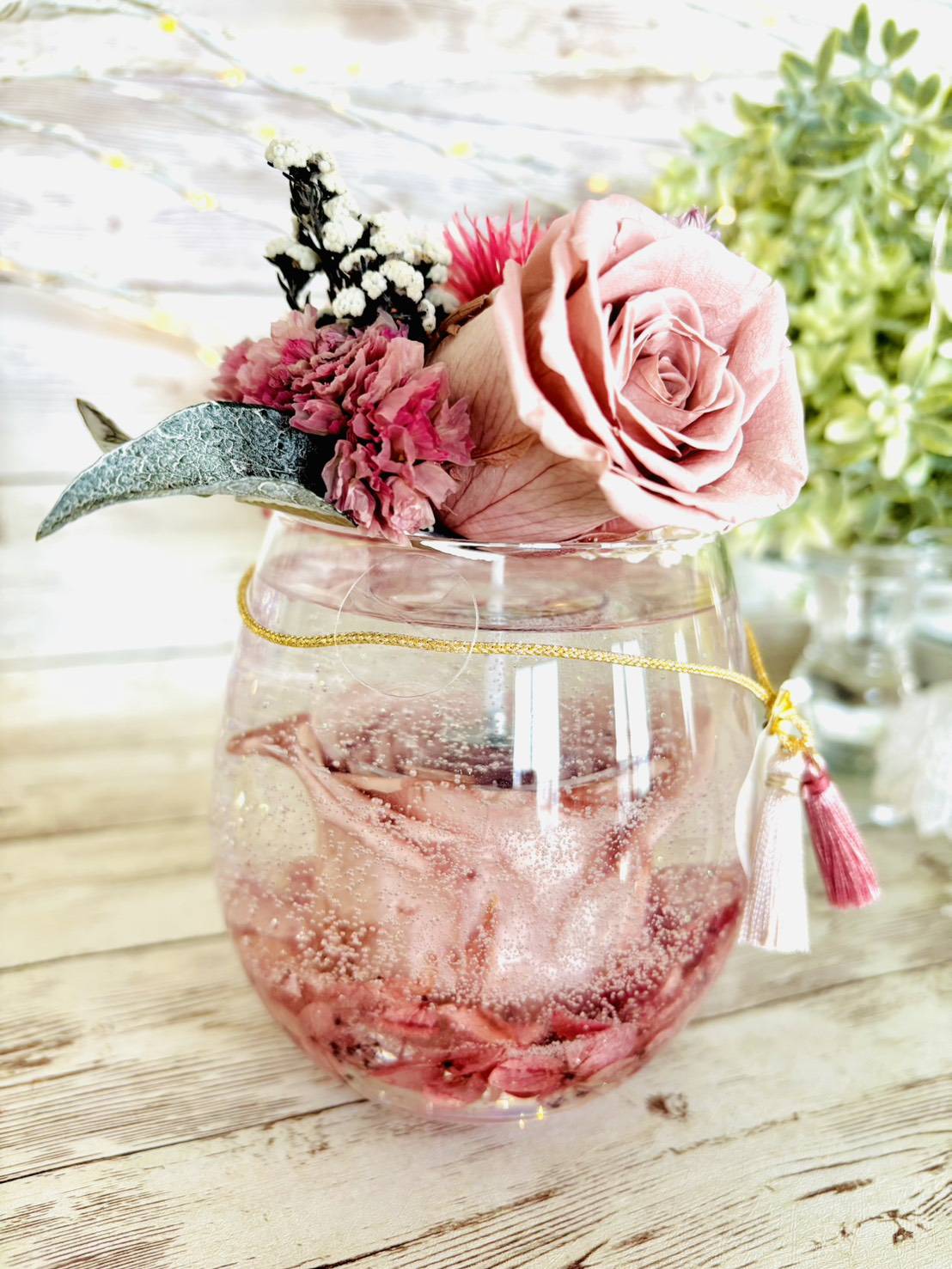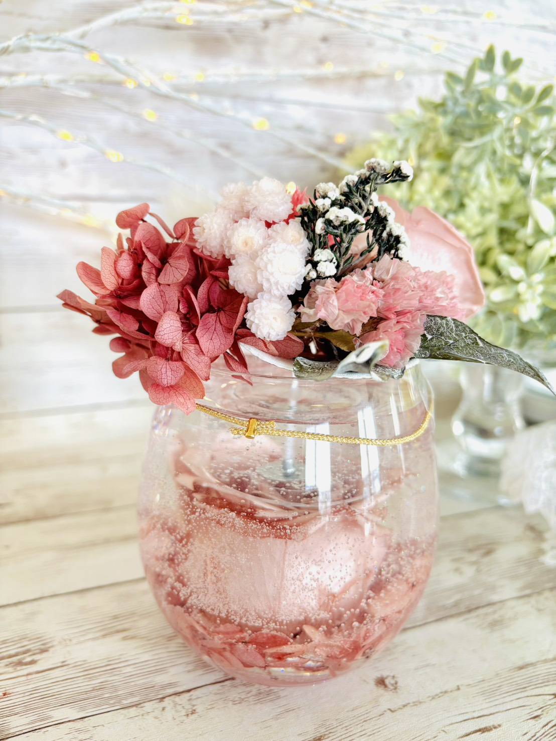 シャンパンローズ アンティークピンク 2025年10月23日 最終更新日時 : 2025年10月23日 voice S__249061401S__249061400S__249061399S__249061398S__249061397S__249061396 アンティークピンクのプリザーブドローズをプリザーブドのアジサイと一緒にジェルキャンドルに閉じ込めました。上にセットしたキャンドル部分のみが燃焼するようになっておりますので、キャンドルとして使用した後もそのまま飾ってお楽しみいただけます。飾りのドライフラワーはコサージュのようになっておりますので、点灯の際には取り外し、キャンドルを楽しんだ後はもう一度上に載せて飾っていただけます。<金額>4,000円(税込)<サイズ>・グラスのみ高さ 10センチ直径 9.5センチ・全体高さ 約15センチ最大幅 約13センチ