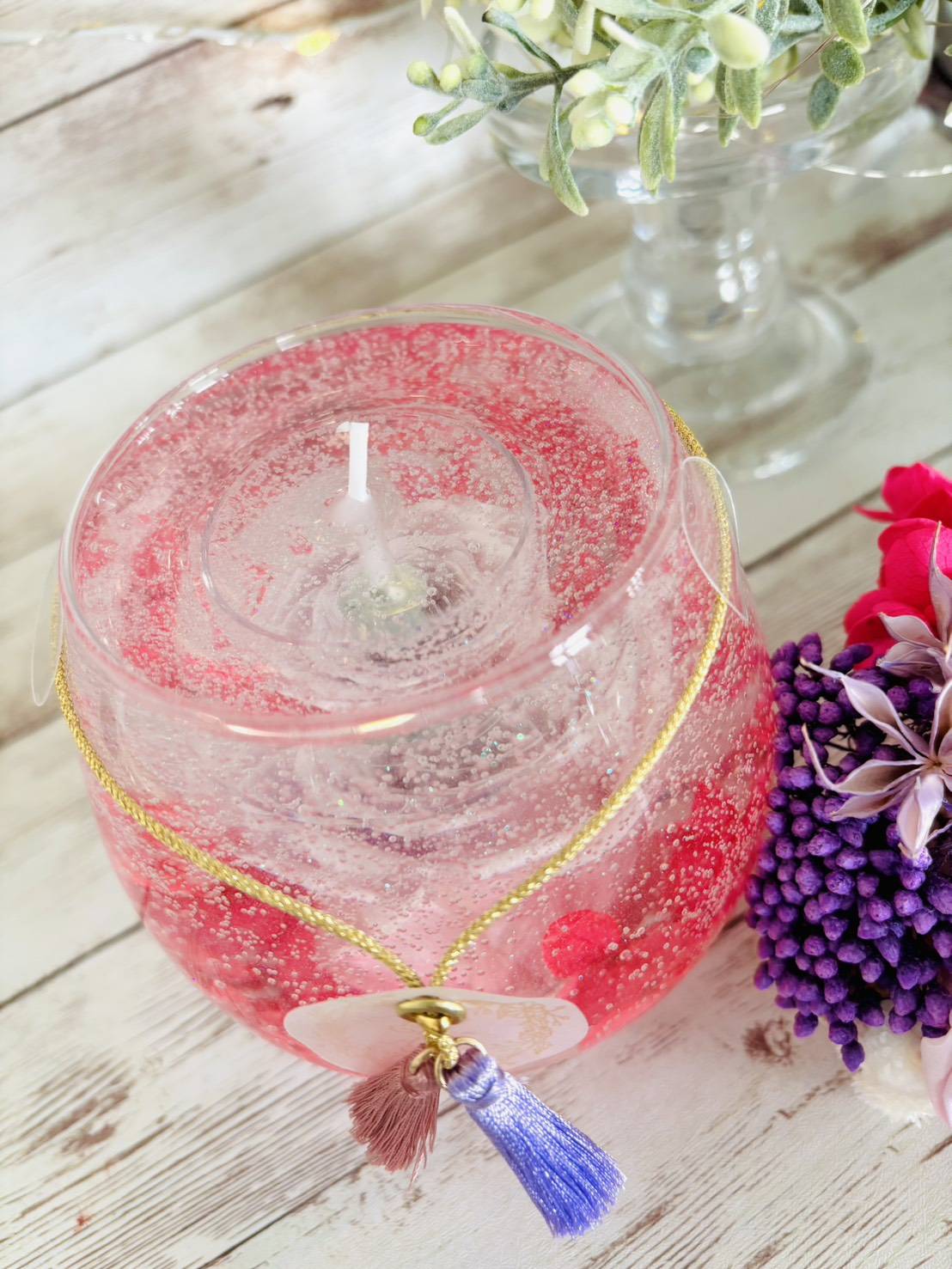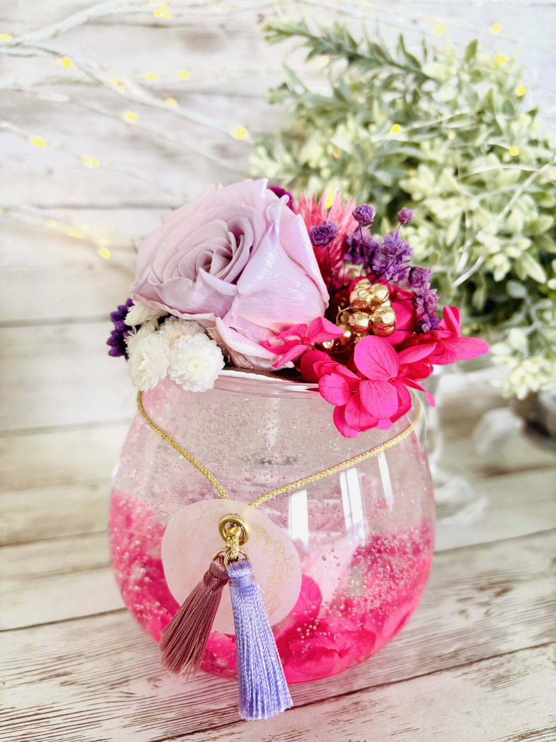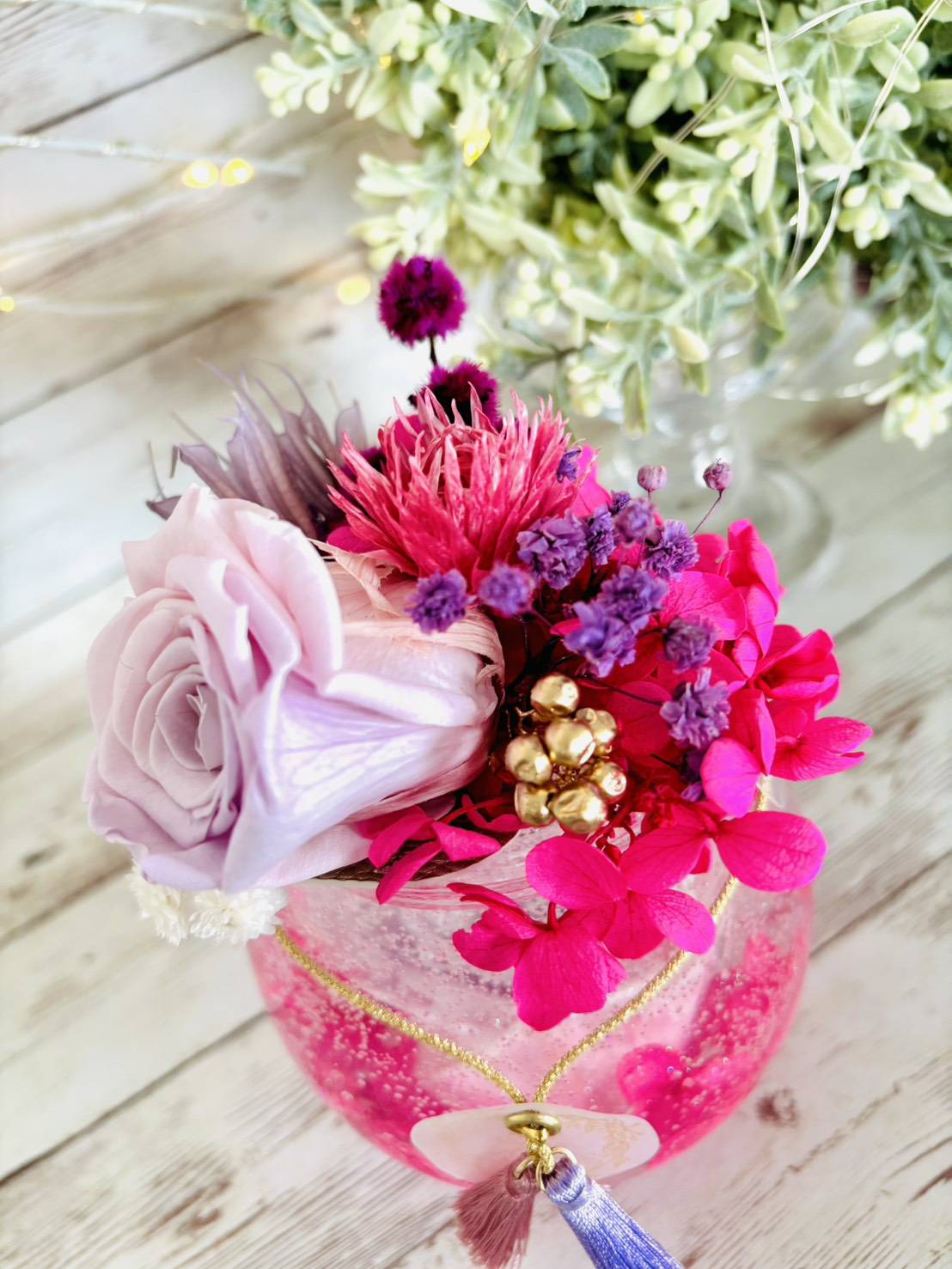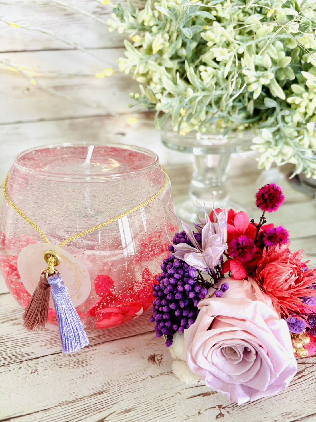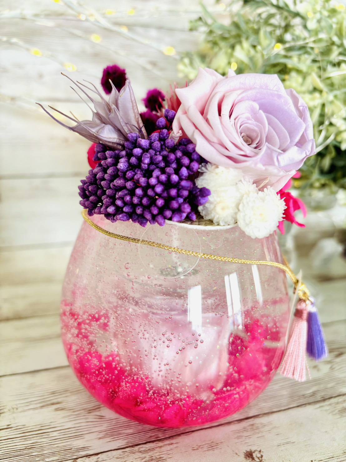 スウィンググラス ピンクパープル 2025年11月20日 最終更新日時 : 2025年11月20日 voice S__252616717S__252616713S__252616714S__252616715S__252616716 底が丸いのでツンとつつくとゆらゆらと揺れるスウィンググラスに、バラを入れました。ジェルキャンドルが泡立ってシャンパンの中に浮かぶバラのように見えます。上にセットしたキャンドル部分のみが燃焼するようになっておりますので、キャンドルとして使用した後もそのまま飾ってお楽しみいただけます。飾りのドライフラワーはコサージュのようになっておりますので、点灯の際には取り外し、キャンドルを楽しんだ後はもう一度上に載せて飾っていただけます。お花の入荷時期や状態によって使用するお花が変わったり、お花の位置が変わったりすることがあります。<金額>4,000円(税込)<サイズ>グラスの直径 10センチ高さ 8センチ高さ 約15センチ(コサージュを乗せた状態)