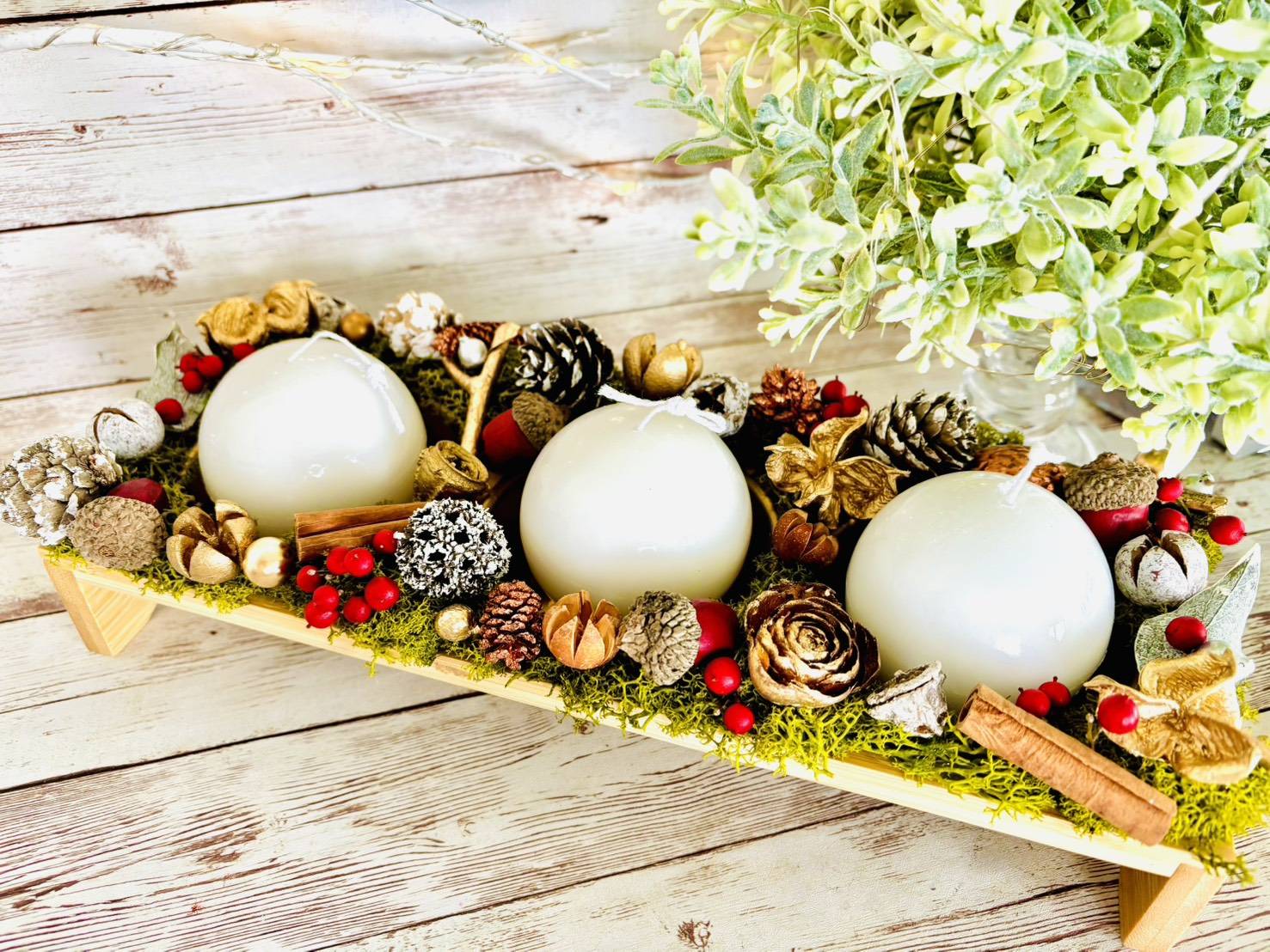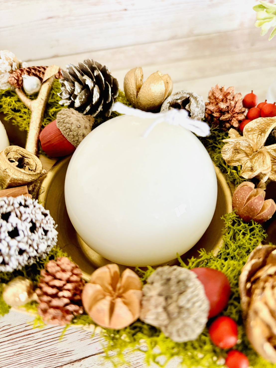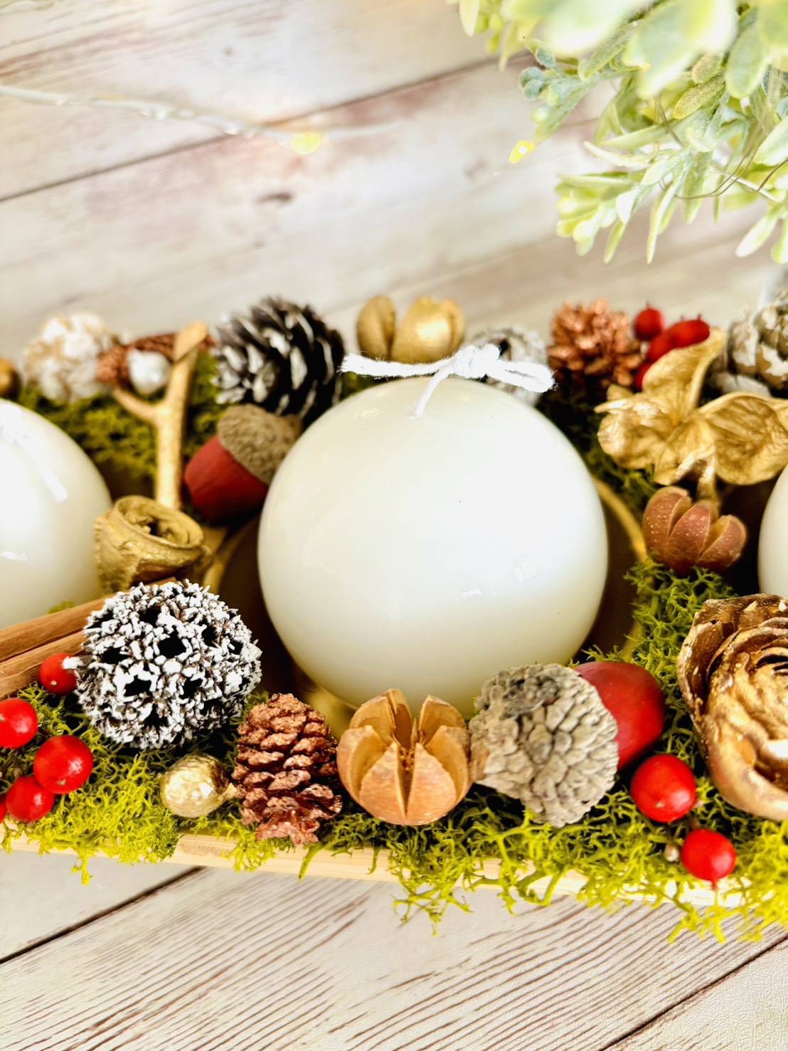 モスや松ぼっくり、南天の赤い実をデコレーションしたバンブー製の器にそれぞれ金木犀、ラベンダー、ローズの香りをつけたミツロウキャンドルを載せました。