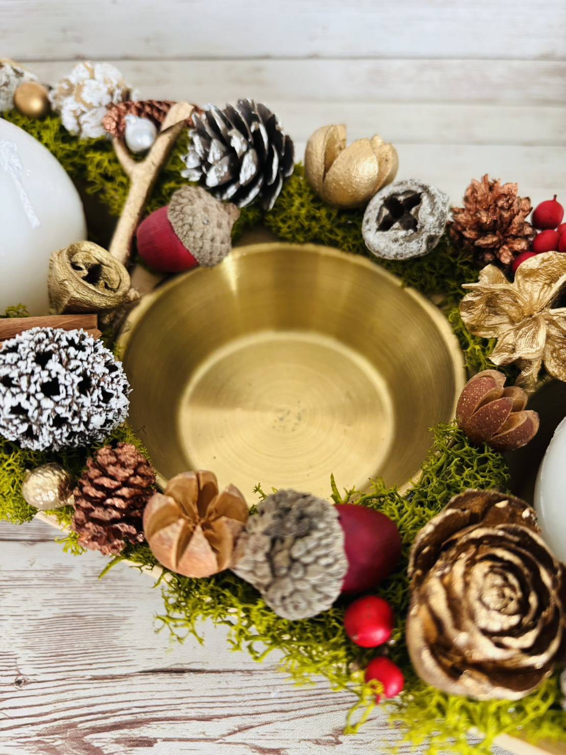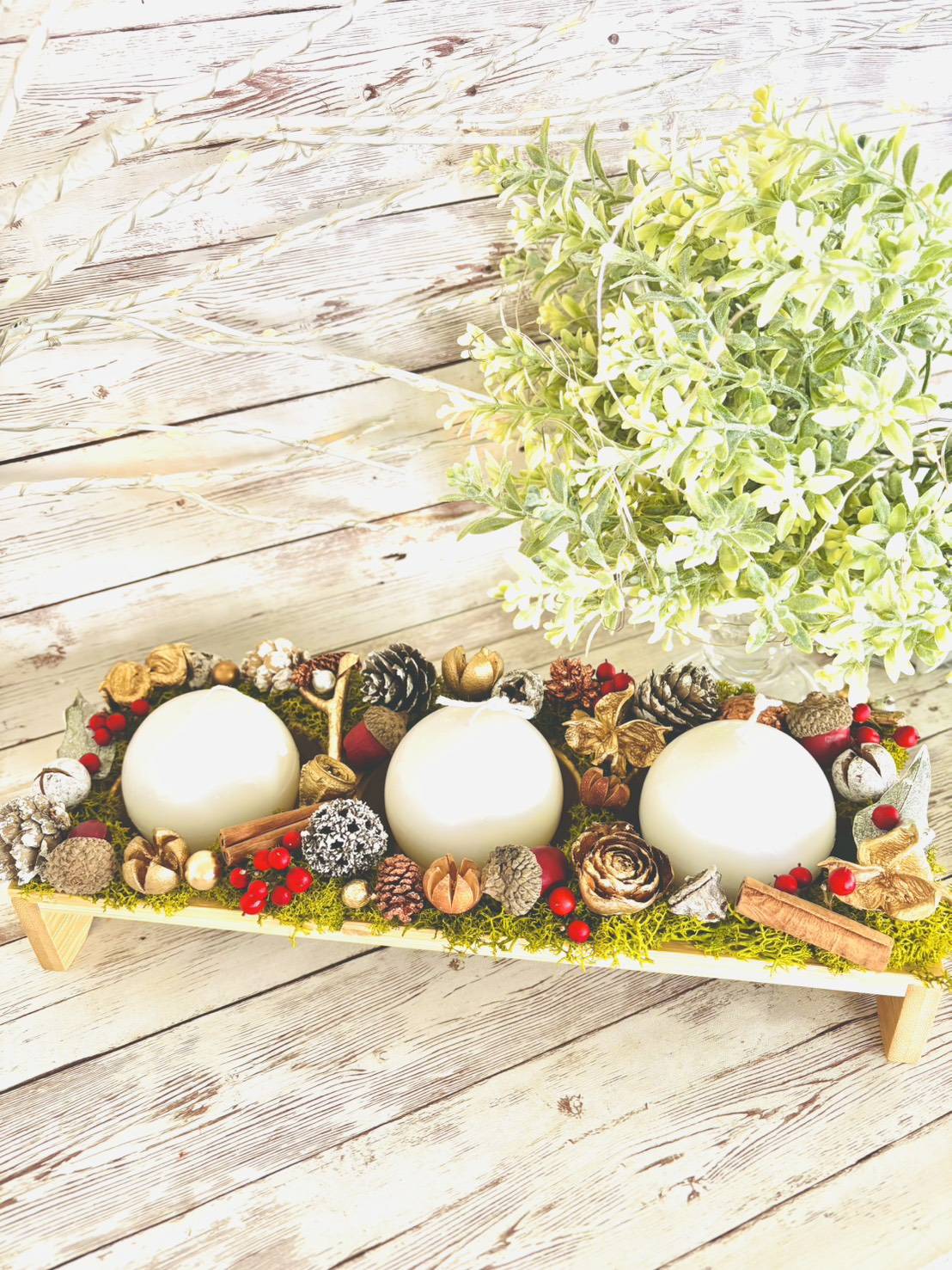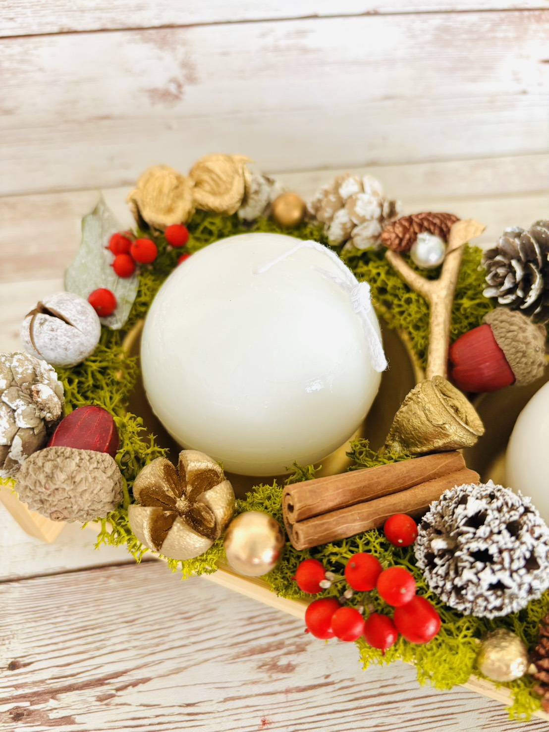 モスや松ぼっくり、南天の赤い実をデコレーションしたバンブー製の器にそれぞれ金木犀、ラベンダー、ローズの香りをつけたミツロウキャンドルを載せました。