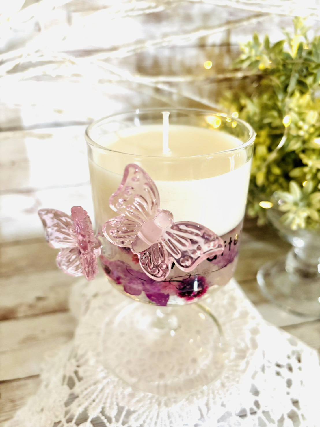 ピンク色の蝶がついた可愛いグラスを見つけたので、小さなお花を入れたジェルとソイのツートンのキャンドルに仕立てました。