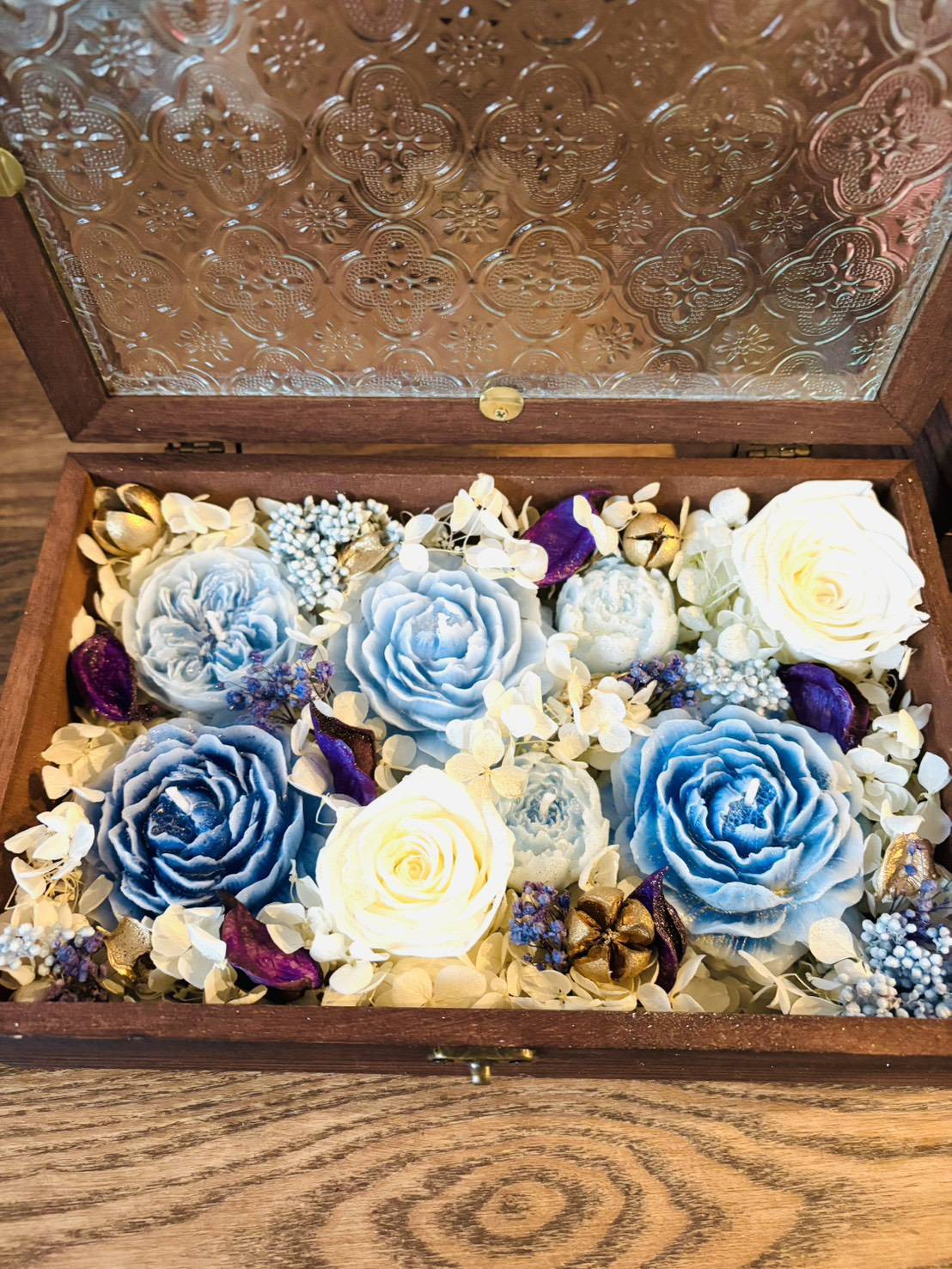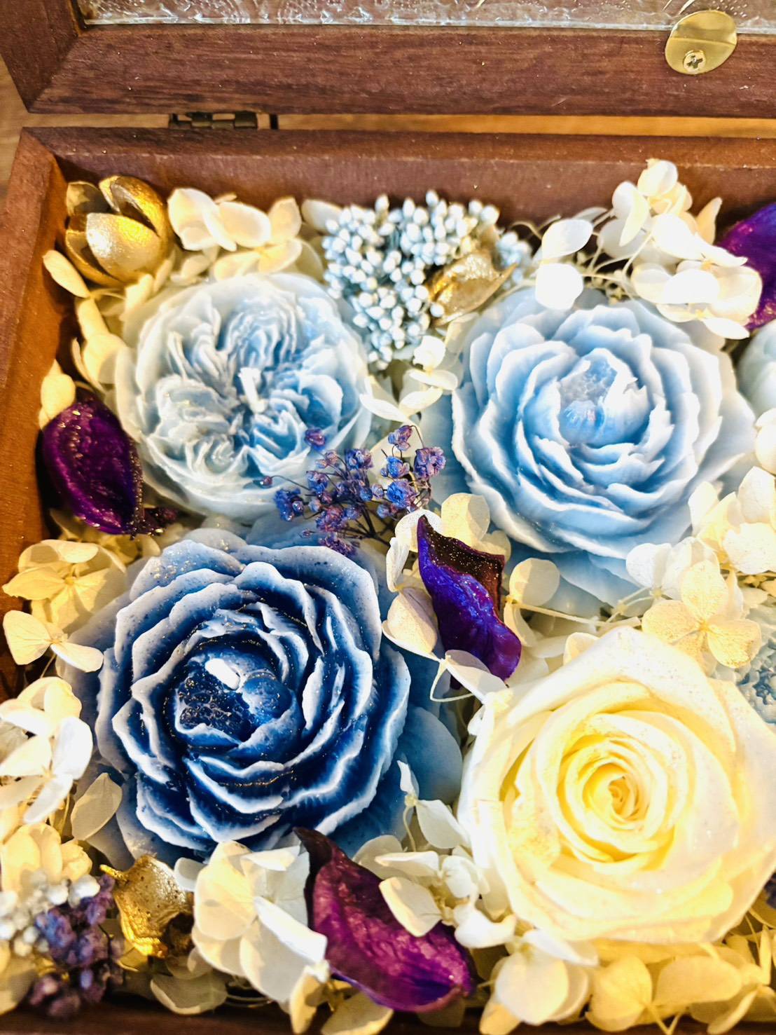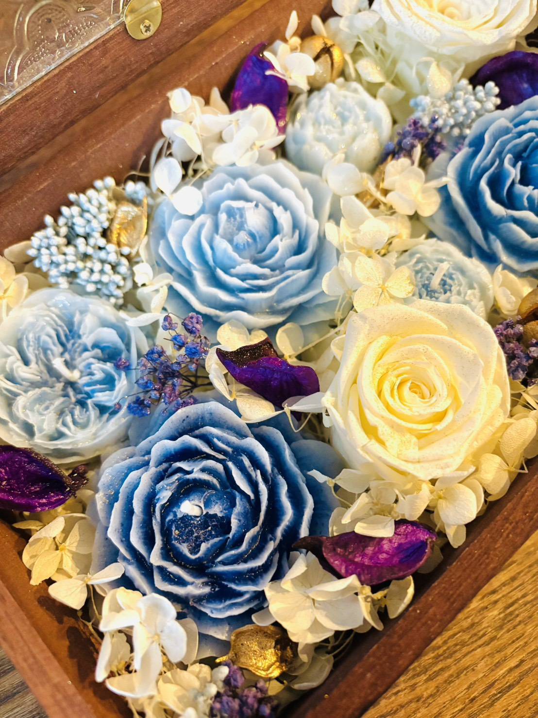 ローズのプレゼントボックス 2026年1月28日 最終更新日時 : 2026年1月28日 voice S__261185540S__261185541S__261185542S__261185543S__261185544 ミツロウで作った3種類の大きさのバラの形のキャンドルを6つと、たくさんのプリザーブドフラワー(バラ、アジサイ、ライスフラワー、かすみ草など)をぎゅっと詰め込んだプレゼントボックスです。ゴールドのラメスプレーで華やかに仕上げました。ガラスとウッドでできたアンティーク風のボックスに入っておりますので、そのままプレゼントして頂けます。無香タイプですので、香りのお好きな方はアロマオイルをお花に振りかけたり、点灯したキャンドルにオイルを少し垂らして楽しむのもおすすめです。<金額>5,500円(税込)<サイズ>縦 15.5センチ横 24センチ高さ 6.5センチ